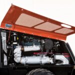 Emissions-compliant engine is enclosed for quiet operation and vibration-isolated to reduce operator fatigue.